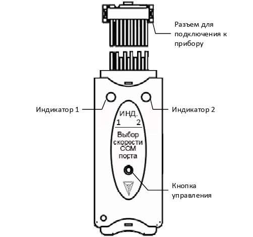 Кнопка управления на лицевой панели УСБ-ППК предназначена для выбора скорости работы COM-порта для ППКО: - для ППКО «Аларм-10, «Аларм-12 и блока сопряжения «Аларм-ППК-Ethernet» скорость порта 115200; - для ППКО «Аларм-11», ППКО «Аларм-14», ППКО «Аларм-15» скорость порта 9600. Индикатор 1 отображает состояние СОМ-порта: индикация отсутствует – соединение не установлено или выбран не верный СОМ-порт; индикация красным цветом – соединение установлено. Индикатор 2 отображает выбранную скорость: индикация зеленым цветом – скорость 115200; индикация красным цветом – скорость 9600.