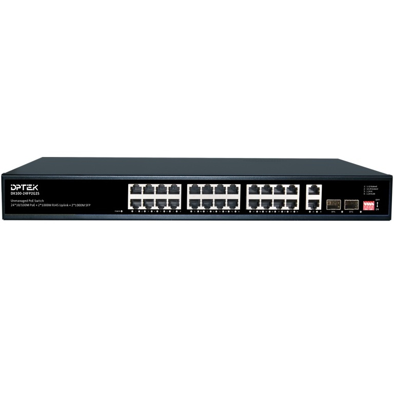 Коммутатор DPTEK DK100-24FP2G2S, неуправляемый, 24*10/100Base-T PoE 802.3af/at + 2*10/100/1000Base-T + 2*1000Base-X SFP, дальность до 250м, 320Вт.