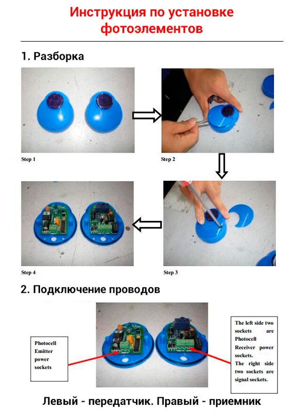 Фотоэлементы (пара), устанавливаются на тумбу шлагбаума и опору для стрелы. Устройство, состоящее из инфракрасного передатчика и приемника, которые устанавливаются в проем автоматических ворот или шлагбаума для обеспечения максимальной безопасности их использования. В случае пересечения инфракрасного луча в блок управления поступает сигнал о появлении препятствия в опасной зоне действия автоматической системы. Это приводит к остановке или реверсу полотна ворот, в зависимости от установленной логики работы.