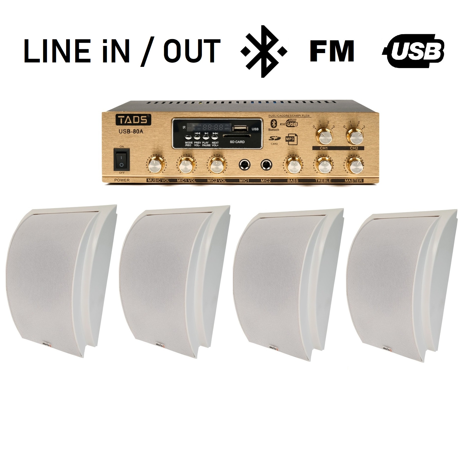 Комплект озвучивания на 4 колонки по 10Вт и 1 усилитель до 80 Ват