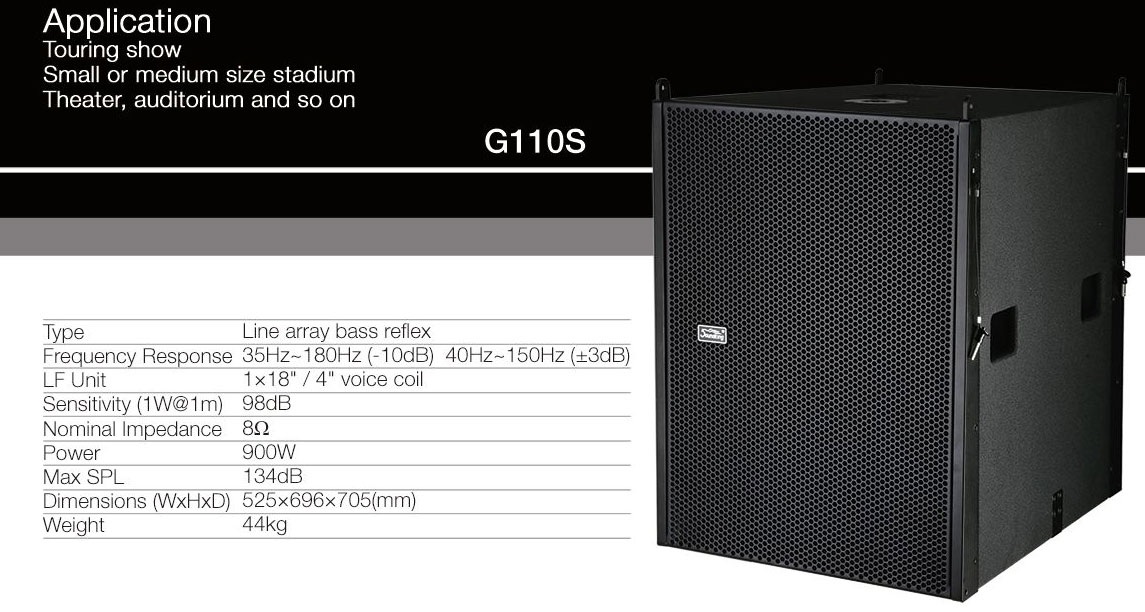 G110S Сабвуфер, элемент линейного массива, Soundking. Сабвуфер с динамиком 18", расширяет низкие частоты в составе линейного массива с системами G110. Сабвуфер G110S использует неодимовый магнит, что позволяет преодолеть недостаток традиционных сабвуферов — шум воздуха при высокой динамике. Модель может быть подвешен в составе линейного массива, установлен на полу или на стойке для работы с G110. Корпус изготовлен из березовой фанеры высокой плотности и покрыт прочной черной краской. Усиленная структура помогает снизить потери энергии и сделать низкие частоты более мощными. Ручки обеспечивают удобство переноски. Низкочастотный элемент линейного массива.