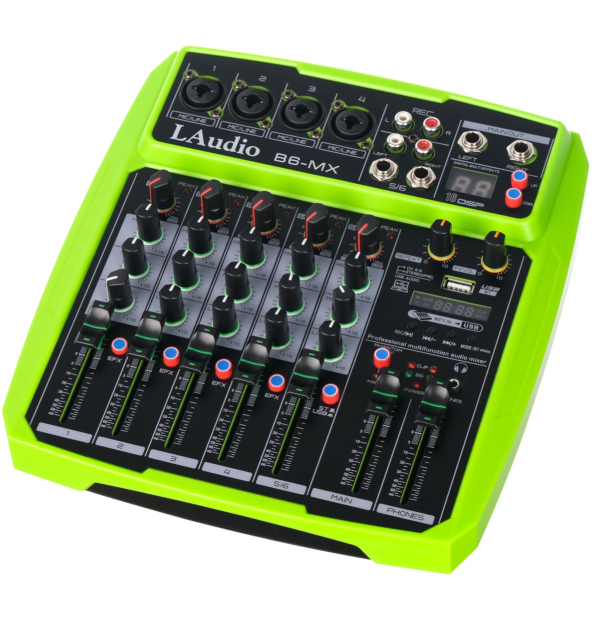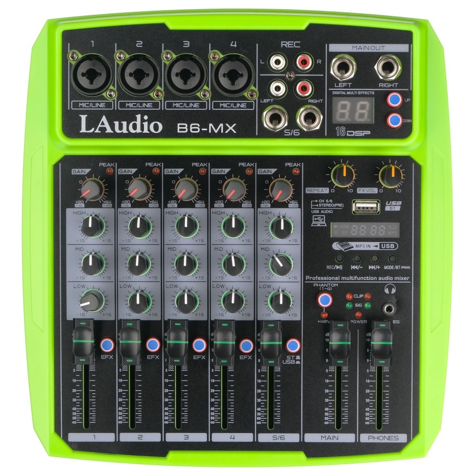 B6-MX Микшерный пульт, 6 каналов, LAudio. MP3-плеер с функцией записи. Подключение Bluetooth. 4 моно + 2 стерео входа. 3-полосный эквалайзер. 16 DSP-эффектов. Интерфейс USB для подключения компьютера.