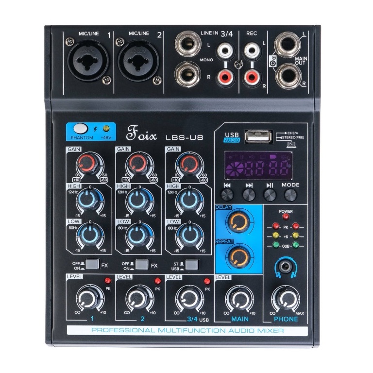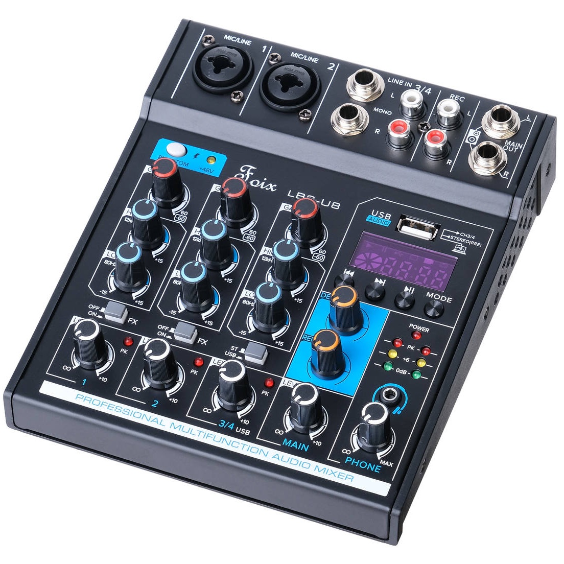 Микшер имеет несколько входов, встроенный фантомный источник питания 48В, гитарный усилитель с высоким импедансом, Bluetooth/MP3-плеер, эффектор и т.д.