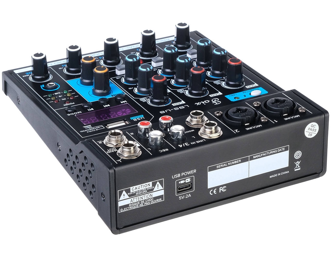 BT/MP3-плеер. Встроенный Bluetooth/MP3 плеер последнего поколения поддерживает форматы mp3, wav, APE, FLAC и другие аудиоформаты. Стандартная система Bluetooth 4.2, поддерживает Bluetooth 2.1 + EDR; при подключении компьютера с помощью USB-кабеля микшер можно использовать в качестве звуковой USB карты для воспроизведения музыки и записи. Микшер совместим с программным обеспечением для ведения трансляций в прямом эфире, не требует установки драйвера.
