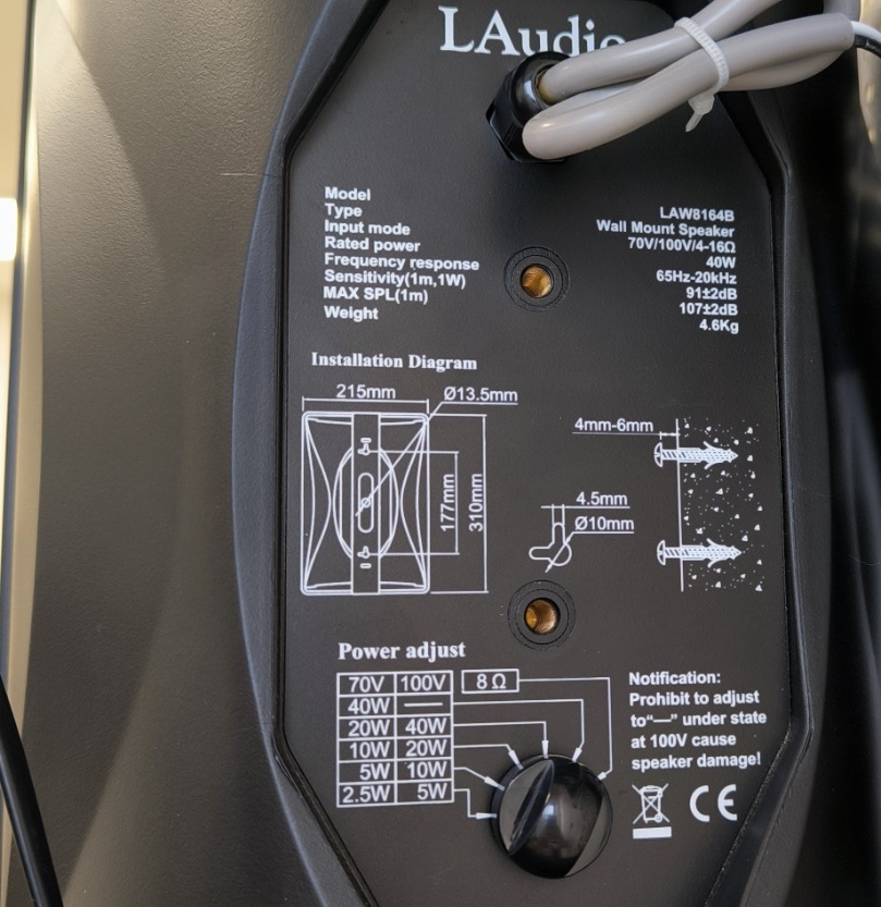 LAW8164B Настенный громкоговоритель, 40Вт, черный, LAudio. Встроенный аттенюатор регулировки мощности 8 Ом - 5 - 10 - 20 - 40Вт. Вход 70 В/100 В/8 Ом. Широкий диапазон частот: 65 Гц–20 кГц. Максимальный уровень звукового давления: 107±2 дБ. Высокая чувствительность: 91±2 дБ. Громкоговоритель настенного типа. Металлическая решетка и корпус из АБС-пластика черного цвета. Оснащен отверстиями для подвешивания для удобного монтажа. Динамик: 6,5" х 1, 1" х 1. Номинальная мощность: 40 Вт. Вход: Постоянное напряжение: 70/100В. Постоянное сопротивление: 8 Ом. Чувствительность (1М, 1Вт): 91±2дБ. Максимальный уровень звукового давления (1 м): 107 ± 2 дБ. Частотный диапазон: 65 Гц - 20 кГц. Цвет: черный. Размеры: 310 х 215 х 203 мм. Вес: 4,6 кг.