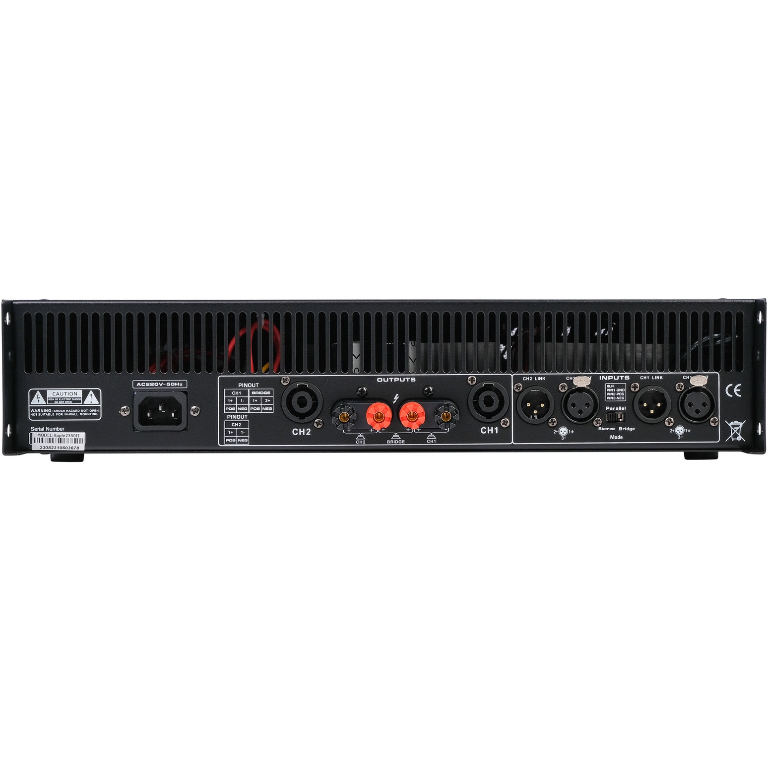 Охлаждение устройства реализовано с помощью вентилятора с переменной скоростью вращения. Усилитель защищен от короткого замыкания и перенапряжения. На передней панели размещены ручки регулировки мощности, кнопка включения и светодиодные индикаторы, а на задней панели располагаются переключатель режимов работы Bridge/Stereo/Parallel, балансные входы на трехконтактных разъемах XLR, а также выходы на высококачественных разъемах speakON.
