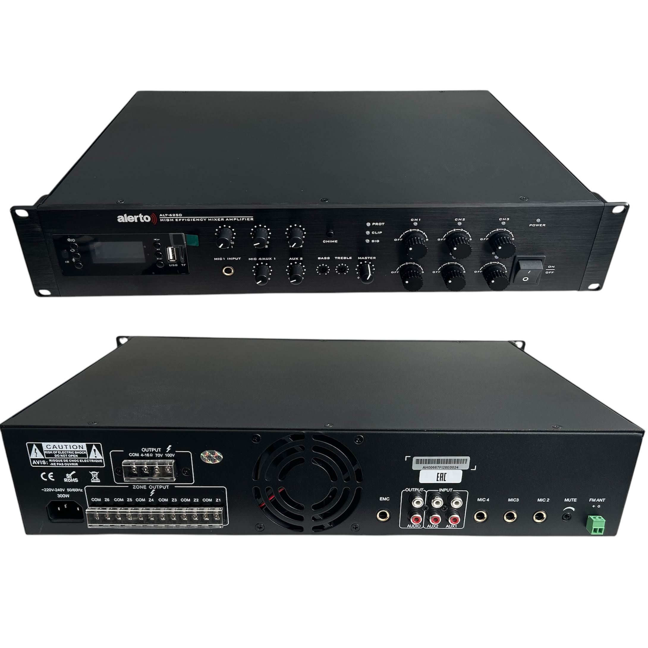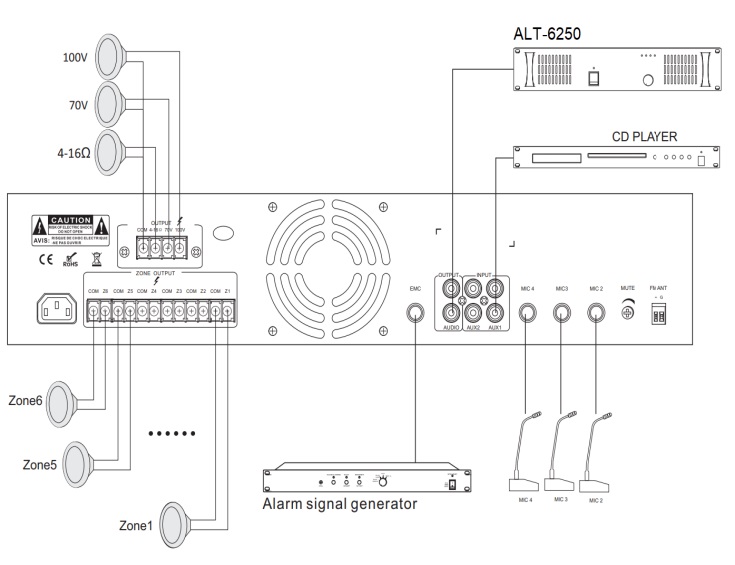 ALT-6250 Микшер-усилитель 240Вт, 6 зон трансляции. Индивидуальная регулировка громкости в каждой зоне. 4 микрофонных, 2 линейных входа. МР3 плеер (FM радио, USB, SD, Bluetooth). ИК-пульт ДУ. ЕМ вход с наивысшим приоритетом. На передней панели расположена кнопка "Гонг" для подачи предупреждающего сигнала тревоги. Усилители этой серии являются оптимальным решением для организации музыкальной и рекламной трансляции, громкоговорящей связи, экстренного оповещения в ручном режиме, оповещения ГОЧС для средних объектов: торговых центров, офисных помещений, автостоянок, школ, больниц и прочих зданий и открытых территорий.