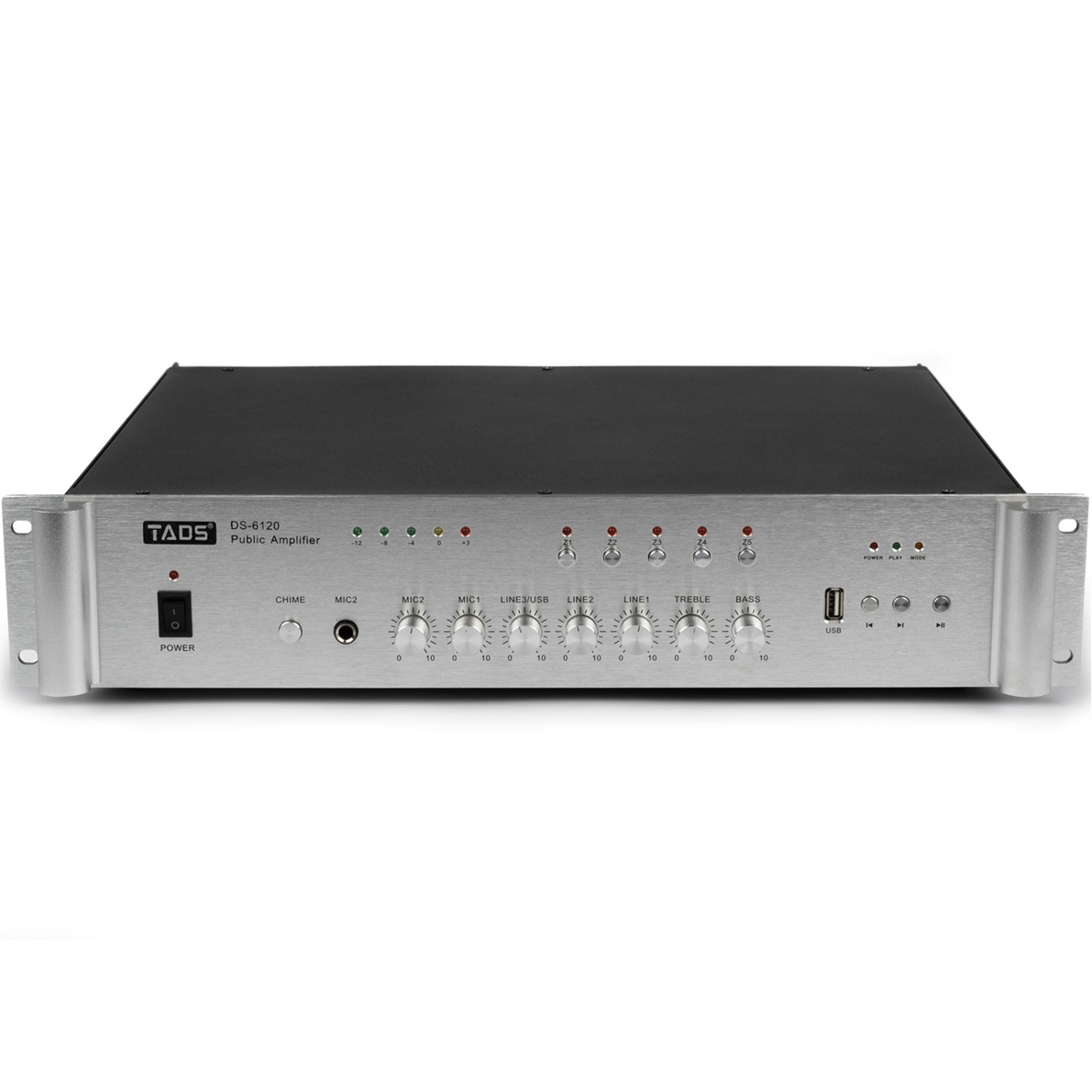 DS-6120 Усилитель мощности трансляционный, 120Вт, TADS. 2 микрофонных входа с контролем громкости. Микрофонный вход на лицевой панели имеет приоритет. 3 линейных входа с контролем громкости. Регуляторы высоких и низких частот. Тональный сигнал. Порт USB. Индикация выходного уровня. Селектор зон: 5. Встроенный медиаплеер. Клеммный блок 16 Ом/70В/110В. Выход на монитор. Мощность: 120Вт. Выходной ток: 1.2А. Частотный диапазон: 60-16000Гц. Коэффициент нелинейных искажений: 0,1% (1кГц 0дБ). Отношение Сигнал/Шум: микрофон: 66дБ, линия 102дБ. Входная чувствительность: микрофон -50дБ/600Ом; линия -10дБ/10кОм. Питание: 220В 50Гц. Размеры: 480 х 370 х 88мм.