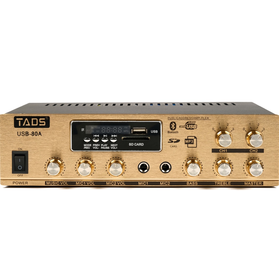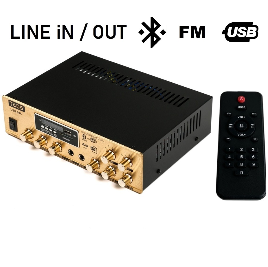 DS-80A (DS-USB-80A) Усилитель мощности, трансляционный, 80Вт, 100V, двухзонный - регулировка каждого канала,TADS. Встроенный Bluetooth, MP3-плеер, USB-порт, слот для SD-карты и FM приемник. 2 микрофонных входа. Линейный вход. Линейный выход. Независимое управление громкостью микрофонов. Регуляторы высоких и низких частот на выходном канале. Выходное сопротивление: 4-16 Ом, 70/100В. Выходная мощность: 80 Вт. Чувствительность микрофонного входа: 20 мВт. Чувствительность линейного входа: 250 мВт. Частотная характеристика: 100 Гц-16 кГц - 3 дБ. THD (общие гармонические искажения): 0,5% (1 кГц 1 Вт 16 Ом). Диапазон частот приемника: 7.5МГц-108 МГц (FM). Поддерживаемый формат аудио: MPEG AUDIO LAYER3. Питание: 220В 50Гц. Защита от перегруза: предохранитель 5А/250В. Размеры: 253х185х68 мм.