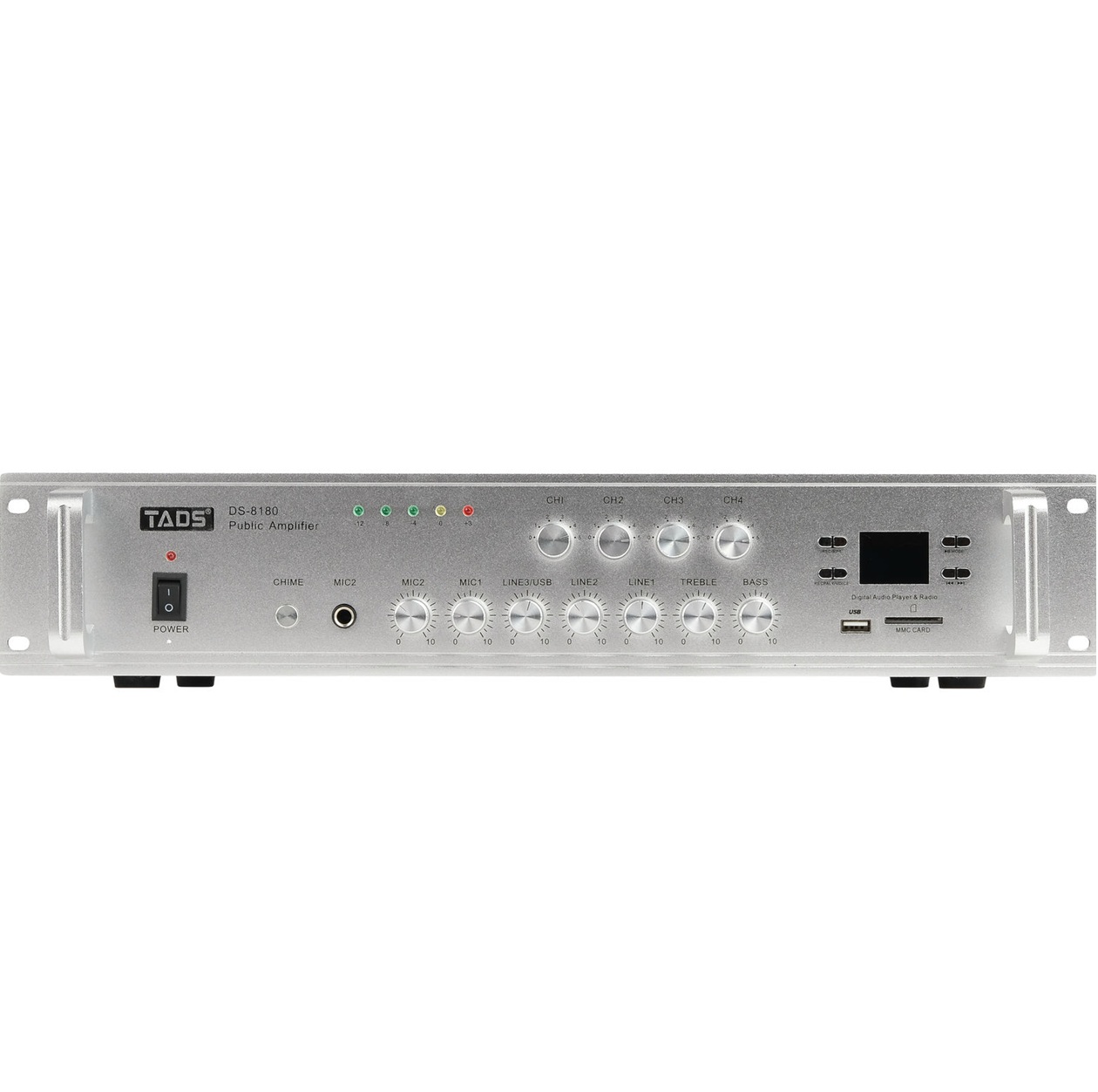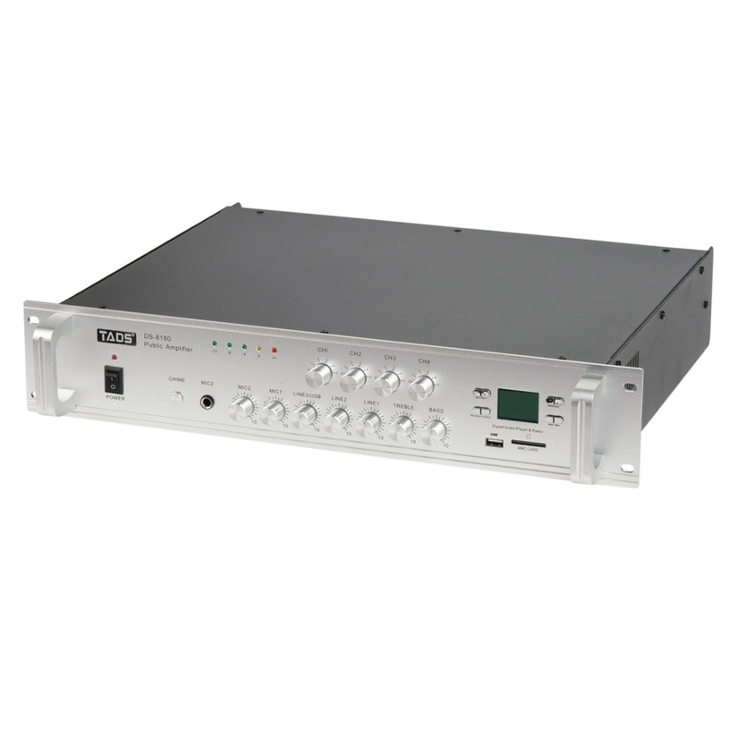 DS-8180 Усилитель мощности трансляционный, 180Вт, TADS. Встроенный Bluetooth, MP3-плеер, USB-порт, слот для SD-карты и FM приемник. Два микрофонных входа, микрофон 1 оснащен функцией отключения звука. Регуляторы высоких и низких частот на выходном канале. Три линейных входа. Выход на монитор. 4 отдельных зональных регуляторов громкости. Индикация выходного уровня. Тональный сигнал. Клеммный блок 16 Ом/70В/110В. Режим записи с микрофона и сохранение на USB-накопитель/ режим одиночной и последовательной петли. Номинальная выходная мощность: 180 Вт. Частотная характеристика: 60 Гц-16 кГц +/- 2 дБ. THD (общие гармонические искажения): 0,1% (1 кГц 0 дБ). Отношение сигнал/шум микрофон: 66 дБ. Отношение сигнал/шум линия: 102 дБ. Чувствительность микрофонного входа: -50 дБ/600 Ом. Чувствительность линейного входа: -10 дБ/10 кОм. Питание: 220 В /50 Гц. Размеры: 480 х 370 х 88мм. Вес: 10 кг.