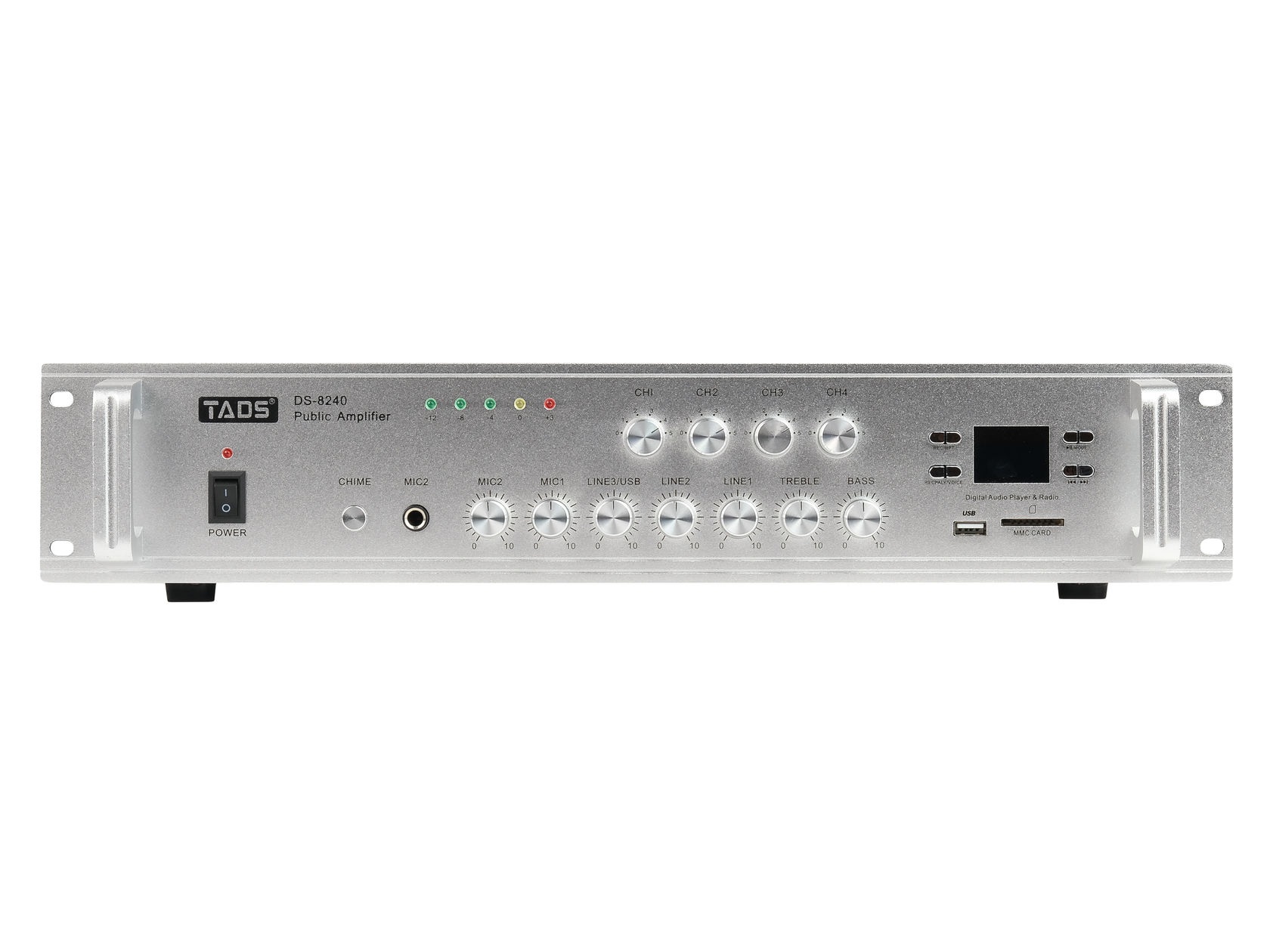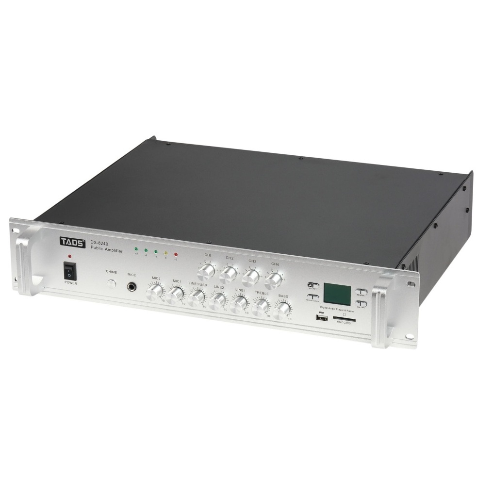 DS-8240 Усилитель мощности трансляционный, 240Вт, TADS. Встроенный Bluetooth, MP3-плеер, USB-порт, слот для SD-карты и FM приемник. Два микрофонных входа, микрофон 1 оснащен функцией отключения звука.