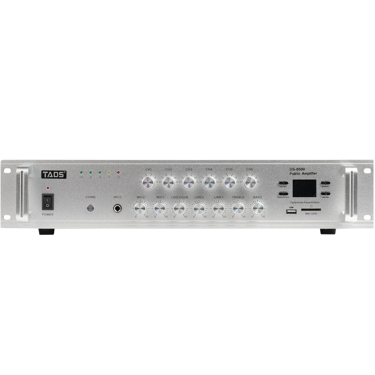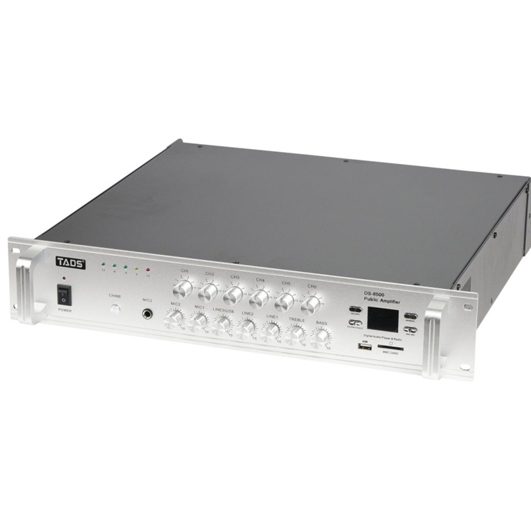DS-8500 Усилитель мощности трансляционный, 500Вт, TADS. Встроенный Bluetooth, MP3-плеер, USB-порт, слот для SD-карты и FM приемник. Два микрофонных входа, микрофон 1 оснащен функцией отключения звука. Регуляторы высоких и низких частот на выходном канале. Три линейных входа. Выход на монитор. 6 отдельных зональных регуляторов громкости. Индикация выходного уровня. Тональный сигнал. Клеммный блок 16 Ом/70В/110В. Режим записи с микрофона и сохранение на USB-накопитель/ режим одиночной и последовательной петли. Номинальная выходная мощность: 500 Вт. Частотная характеристика: 60 Гц-16 кГц +/- 2 дБ. THD (общие гармонические искажения): 0,1% (1 кГц 0 дБ). Отношение сигнал/шум микрофон: 66 дБ. Отношение сигнал/шум линия: 102 дБ. Чувствительность микрофонного входа: -50 дБ/600 Ом. Чувствительность линейного входа: -10 дБ/10 кОм. Питание: 220 В /50 Гц. Размеры: 480 х 370 х 88мм. Вес: 20 кг.