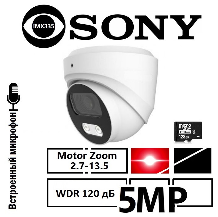 IP антивандальная камера уличная 5 МП / 30fps. Сенсор 1/2.8ʺ SONY Starvis Back‐illuminated iMX335, WDR 120; With IR‐CUT. Интеллектуальная подсветка ИК 40 м + LED белый 30м. Запись на SD до 512GB (SD карта поставляется отдельно). Светочувствительность: цвет 0,001 люкс при (F1.6, AGC включен), 0 люкс при белом свете, черно-белый: 0 люкс при ИК-подсветке. Объектив 2.7-13.5mm Motor Zoom Auto Focus Lens. Встроенный микрофон. Питание DC12V±10%, 700mA (PoE). Видеоаналитика: Обнаружение вторжений на основе обнаружения людей и транспортных средств, обнаружение пересечения линии на основе обнаружения людей и транспортных средств, обнаружение праздношатающихся на основе обнаружения людей, обнаружение скопления людей на основе обнаружения людей, обнаружение движения на основе обнаружения людей, вход в зону на основе обнаружения людей и транспортных средств, выход из зоны на основе обнаружения людей и транспортных средств. Корпус металл: ¢115 x 113 мм. P2P доступ CV380, VMS380. Корпус металл: ¢115x 113 мм. P2P доступ, Bitvision, iVMS320. Полное соответствие для подключения к видеорегистраторам Cantonk и Longse. ONVIF 19.12 (профиль S/T)