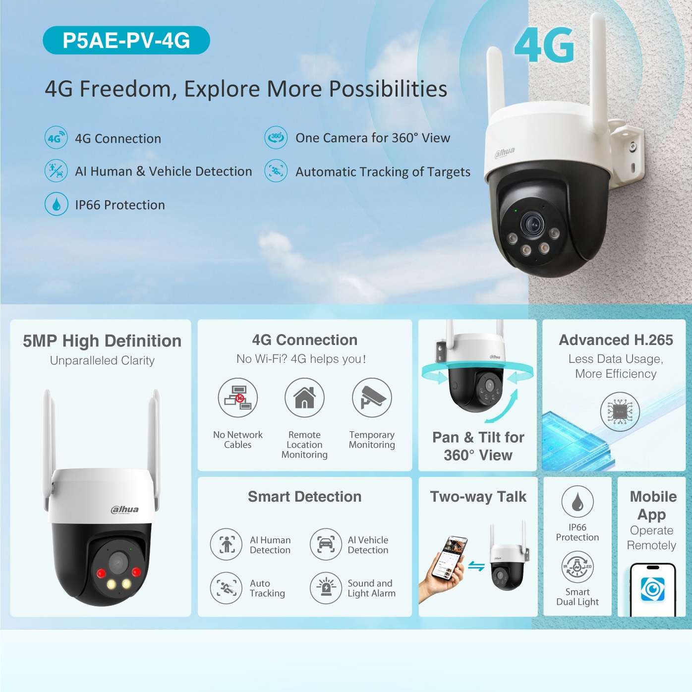 P5AE-PV-4G Мини-PT IP-видеокамера с 4G модулем 5Мп; 1/2.8” CMOS; объектив 4мм; механический ИК-фильтр; чувствительность 0.05лк F1.6; сжатие: H.265+, H.265, H.264+, H.264, MJPEG; 2 потока до 5Мп 25к/с; видеоаналитика: охрана периметра, обнаружение людей+автоматическое слежение, обнаружение транспортных средств, SMD 3.0; ИК-подсветка 30м, Led-подсветка 30м; встроенные микрофон+динамик; MicroSD до 256 Гбайт; защита: IP66, питание: 12В(DC).