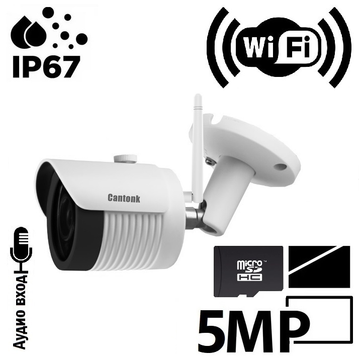 IP WiFi цилиндрическая камера уличная 5 МП / 15fps. Матрица 1/2.5" High-resolution CMOS Sensor. Fullhan 8856; With IR-CUT; 5MP HD Lens. Main Stream: 5MP при 20fps, 4MP при 25fps, 1080P при 30fps. H.264/H.264+/H.265/H.265+. Максимальная дальность WiFi 300м. SD слот поддержка до 256GB. Аудиовход RCA. ИК подсветка 30 м. Светочувствительность 0.01 Lux. Объектив 3.6мм. Питание 12В. Видеоаналитика: детекция движения по секторам, маскировочные зоны. Корпус металл: ¢157(W) x 70(H) x 66(D)mm. P2P технология. ONVIF 2.4.