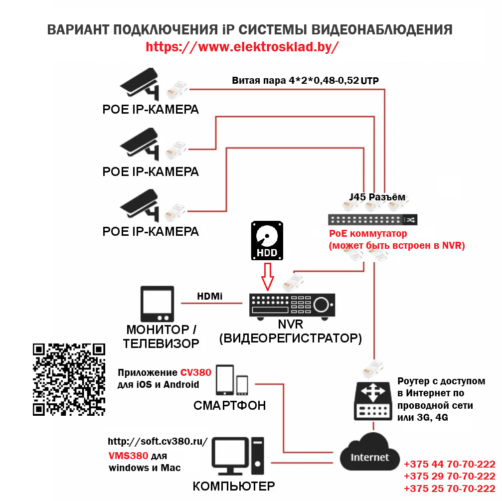 Комплект видеонаблюдения на 8 камер специально разработан для самостоятельной установки. Он включает: видеорегистратор, восемь уличных или внутренних iP камер с ночной подсветкой до 25 м разрешения 4МП и все необходимые аксессуары для подключения камер видеонаблюдения. Запись видео может производиться по движению, расписанию или постоянно.