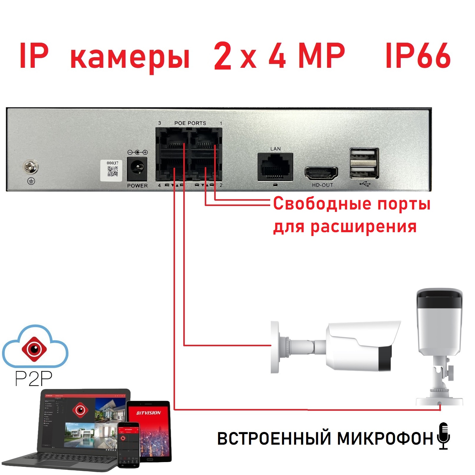 Комплект IP камеры 2x2 MP - готовый комплект на 2 IP камеры с микрофоном высокого разрешения 2 MP 1080P с возможностью установки на улице или в помещении. Компактное решение - POE коммутатор на 4 IP камеры встроенный в видеорегистратор. Простой монтаж - обожмите стандартный разъём J45 на витой паре и подключите к видеорегистратору. Не платите за монтаж, все просто! Бесплатное приложение для удаленного доступа через интернет с помощбю мобильного телефона или компьютера BitVision.