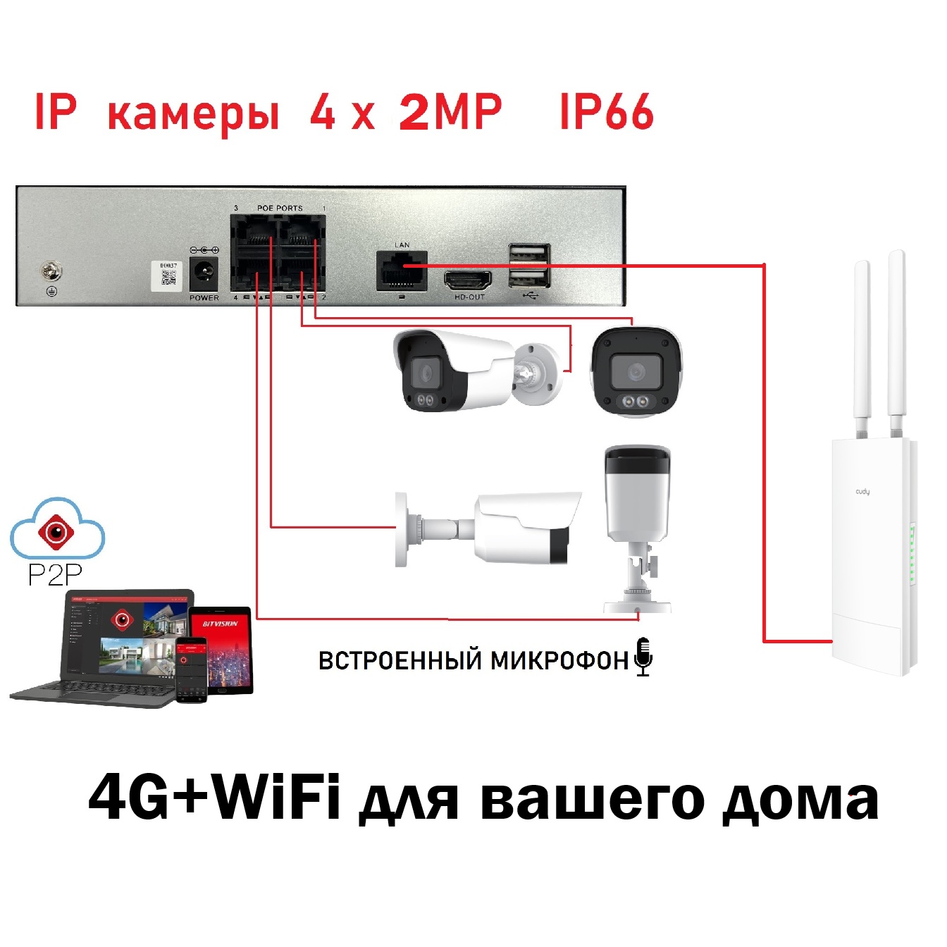 Готовый комплект с доступом через интернет 4G + IP камеры видеонаблюдения 4шт с микрофоном 2 MP с возможностью установки на улице или в помещении. Благодаря наличию WiFi в 4 G роутере вы получити доступ в интернет для Ваших мобильных телефонов и другого оборудования. Компактное решение - POE коммутатор на 4 IP камеры встроенный в видеорегистратор. Простой монтаж - обожмите стандартный разъём J45 на витой паре и подключите к видеорегистратору. Не платите за монтаж, все просто! Бесплатное приложение для удаленного доступа через интернет с помощбю мобильного телефона или компьютера BitVision.