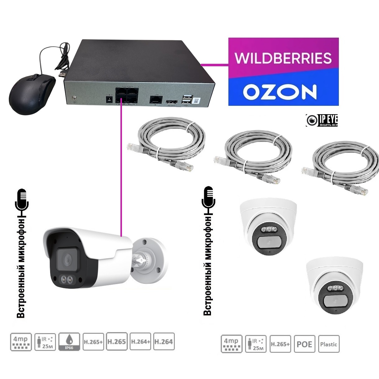 Комплект на 3 камеры видеонаблюдения для пункта выдачи заказов (ПВЗ) Wildberries и OZON с возможностью доступа к облачному сервису IPEYE RU - требует дополнительной настройки по подключению камер видеонаблюдения к облачному сервису IPEYE RU через интернет. Комплект видеонаблюдения на 3 камеры для пункта выдачи заказов (ПВЗ) Wildberries и OZON состоит из: видеорегистратор, три купольные или цилиндрические камеры с микрофоном и ночной подсветкой, разрешение от 1920 х 1080 и аксессуары для подключения камер видеонаблюдения. Запись видео может производиться по движению, расписанию или постоянно.