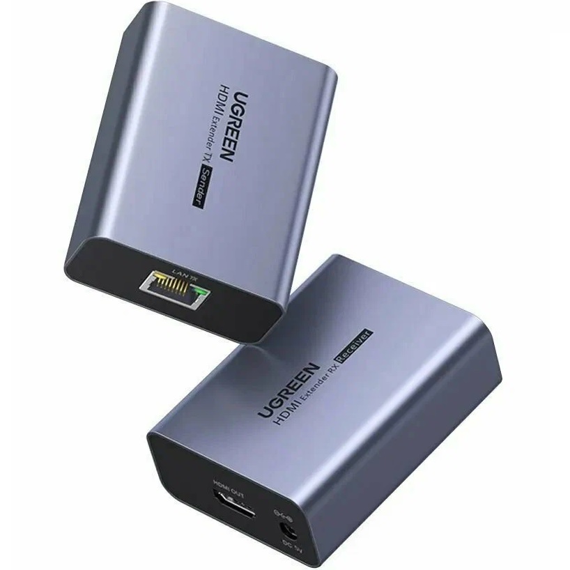 Удлинитель HDMI UGREEN CM455-20519EU Gray по сетевому кабелю Cat5e и Cat6 до 70 м, 1080p. С адаптером питания постоянного тока 1,5 м, 5 В, 1 А (5,5*2,1*10 мм) * 2 шт.