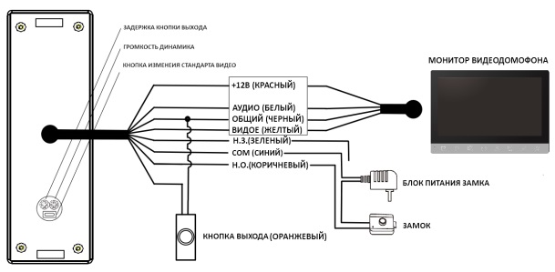 1/2.7” CMOS Sensor цветная, разрешение 1920х1080, Поддержка стандартов AHD-H/AHD-M/CVBS, ИК-подсветка до 4м 120°, угол обзора 160°(1080P) / 140°(720P) / 110°(960H), 4-х проводное подключение, питание DC 11-13В 300мА от монитора, Подключение кнопок «Выход» и "Кнопка изменения режима видеосигнала", рабочая температура -45°С до +50°С, размер 142х47х20мм, Антивандальный корпус IP65. Встроенное реле управления замком. Большой выбор цветов в современном дизайне: черные, серебрянные, золотые и медные цветовые решения. Вызывная панель дает практически панорамную картинку, эффект широкого угла обзора "рыбий глаз". Идеальное решение для просмотра видео без слепых зон. Новое поколение вызывных панелей в комплекте с AHD домофонами позволяет построить систему безопасности с записью по движению от 2 вызывных панелей и 2 камер. Рекомендуемая высота установки вызывной панели 150-160см. Для удобства монтажа в комплекте с вызывной панелью поворотный уголок на 30 градусов и солнцезащитный козырек для установки на улице. Для установки вызывной панели внимательно изучите схему подключения в инструкции или прикрепленной картинке выше.