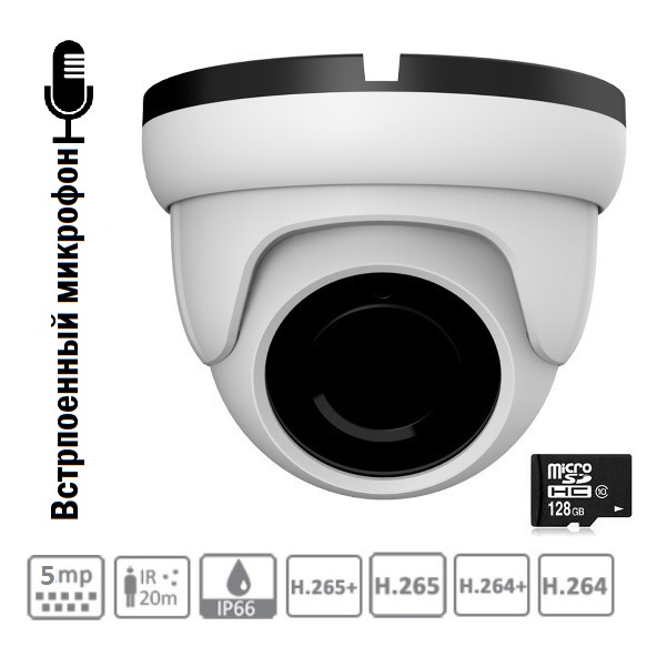 IP антивандальная камера уличная 5MP / 20 fps, 4MP / 25fps, 1080P / 30fps, H.265/H.264. Матрица 1/2.5" SOI High-resolution CMOS Sensor FUHAN SOC, DWDR; With IR-CUT . ИК подсветка 20 м. Запись на SD до 512GB (SD карта поставляется отдельно). Светочувствительность 0.01 Lux. Объектив 2,8 мм. Встроенный микрофон. H.264/H.264+/H.265/H.265+. Питание 12В (PoE). Видеоаналитика: детекция движения по секторам, маскировочные зоны. Пылевлагозащищенная IP68 от -20 до +60. Корпус металл: ¢93 x 74 мм. P2P технология. ONVIF 2.4.