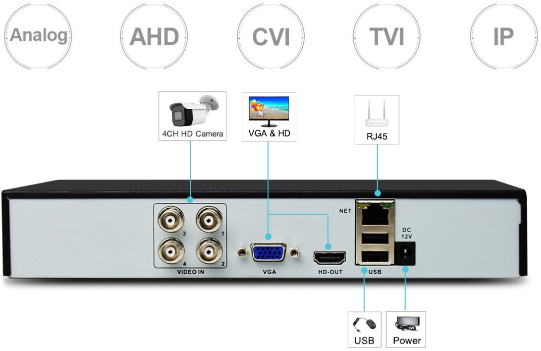 | вход | Нормальный режим: аналоговый: 4 * (TVI / AHD: 5M - 12fps; AHD / TVI / CVI: 4M - 15fps; AHD / TVI: 3M; AHD / TVI / CVI: 1080P / 720P; аналоговый: 960H) |