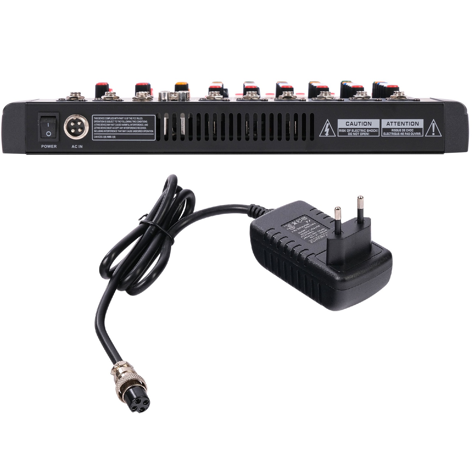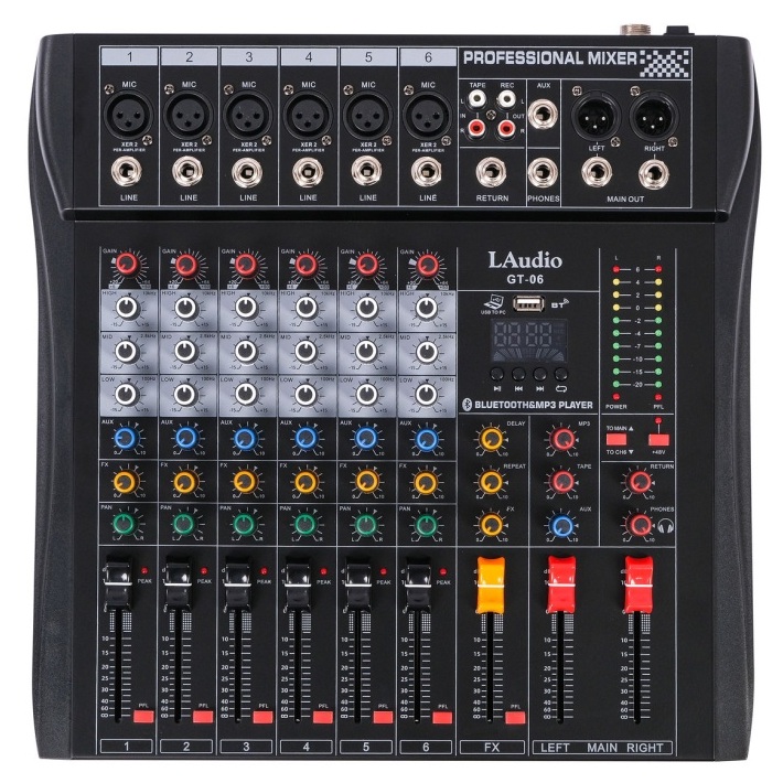 GT-06 Микшерный пульт, 6 каналов, серия PRO, LAudio. Ультранизкий уровень шума микрофонного предусилителя и фантомное питание 48 В. 6 микрофонных и линейных входных разъемов. Усиление, 3-полосный эквалайзер, регуляторы Aux и FX, PAN на каждый канал. Процессор цифровой обработки аудиосигнала. Выход aux, основной стереовыход, выход на наушники, выход эффекта. Проигрыватель MP3, Bluetooth подключение. 60-мм высокоточный фейдер. Встроенный MP3-плеер, поддержка USB. Переключатели Mute для всех моноканалов. Балансный выход XLR.