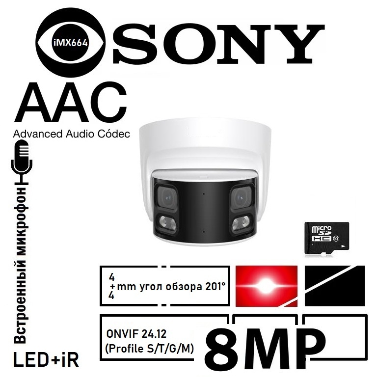 IPF-88IMX664 8Mp 4mm F1.0 LED IR Full Color уличная камера  широкоугольная 201° с 2 объективами, микрофоном и динамиком. Матрица 1/1.8" IMX664 SONY Starvis 2 Back-illuminated iMX664 sensor, ONVIF, Smart IR. Поддержка теплого светодиода LED 4000K 50м + iR инфрокрасного ИК 50м света, smart умная подсветка в режиме интелект при обнаружении человека переключается на теплый видимый свет LED, если в разделе связь аварийной сигнализации выбран параметр мигать теплым светом, то LED свет будет мигать. Светочувствительность 0.001 Lux. H.264 / H.264+ / H.265 / H.265+. Объектив f 4мм + 4мм за счет большого сенсора и двойного объектива дает угол обзора 201°. Питание DC12V±10%, 950mA/Poe IEEE 802.3af 12 Вт. Класс защиты IP67. Видеоаналитика: обнаружение вторжений (на основе обнаружения людей и транспортных средств), обнаружение пересечения линии (на основе обнаружения людей и транспортных средств), обнаружение празднования, обнаружение скопления людей (на основе обнаружения людей), обнаружение движения на основе обнаружения людей, детекция движения по секторам, маскировочные зоны. Protocol TCP/IP, IPv4/v6, ICMP, HTTP, HTTPS, FTP, DHCP, DNS, DDNS, RTP, RTSP, PPPoE, NTP, SMTP, UDP, SNMP, QoS, 802.1x. Корпус металл: ¢152 x 156,28 мм. P2P технология доступа без статического адреса через BitVision, подключение к сервису ipeye. ONVIF 24.12 (профиль S/T/G/M), ivms 320 для записи и просмотра с компьютера ОС iOS и WINDOWS.